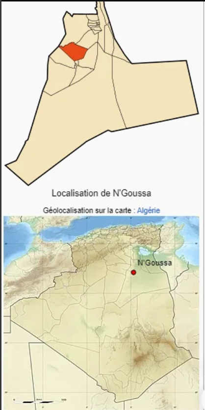 Ngoussa est une petite oasis (ksar) d’Algérie située à une vingtaine de km au nord de Ouargla*, chef-lieu de la wilaya du même nom. Ngoussa a actuellement statut de commune. Elle était jadis sur l’axe caravanier Touggourt-Ouargla, l’un des principaux points de départ vers le grand désert et l’Afrique sahélienne. L’économie traditionnelle reposait sur la palmeraie, la culture des céréales (blé, orge, sorgho, petit mil) et le commercer caravanier.